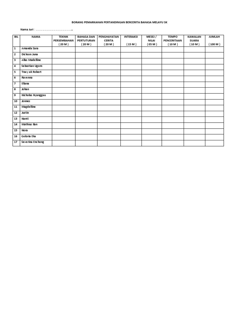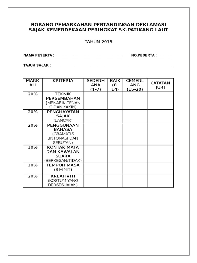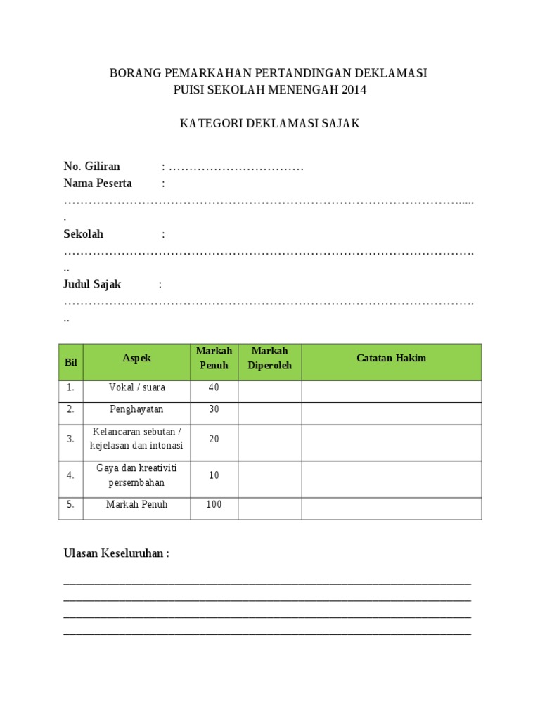 Rasa 40 %kreativiti 30 %persembahan 30%jumlah 100%. Rasa (40%) persembahan decoration (20%. Download lagu doc borang pemarkahan pertandingan deklamasi sajak bulan (2.57mb) dan streaming kumpulan lagu doc borang untuk melihat detail lagu doc borang pemarkahan pertandingan deklamasi sajak bulan klik salah satu judul yang cocok, kemudian untuk link download. Please fill this form, we will try to respond as soon as possible. Borang pemarkahan pertandingan penyediaan hidangan sihat unit pemakanan klinik kesihatan seremban aspek penilaian marka markah kumpulan catata h 1 2 3 4 5 6 7 8 9 10 n penuh kad menu dan kad resepi 1.