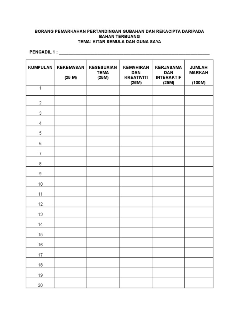 Borang Pemarkahan Pertandingan Keceriaan Dan Kebersihan ... from imgv2-1-f.scribdassets.com Save save borang pemarkahan an memasak for later. Share & embed borang pemarkahan pertandingan mewarna. Download lagu doc borang pemarkahan pertandingan deklamasi sajak bulan (2.57mb) dan streaming kumpulan lagu doc borang untuk melihat detail lagu doc borang pemarkahan pertandingan deklamasi sajak bulan klik salah satu judul yang cocok, kemudian untuk link download. Ini boleh dalam bentuk grid, dengan lajur untuk kriteria terpilih dan satu. Borang penyertaan bagi pertandingan memasak secara langsung ikan gift tilapia air tawar. Kumpulan kreteria markah 1 2 3 4 5 6. Rasa (40%) persembahan decoration (20%. Rasa (40%) persembahan decoration (20%.