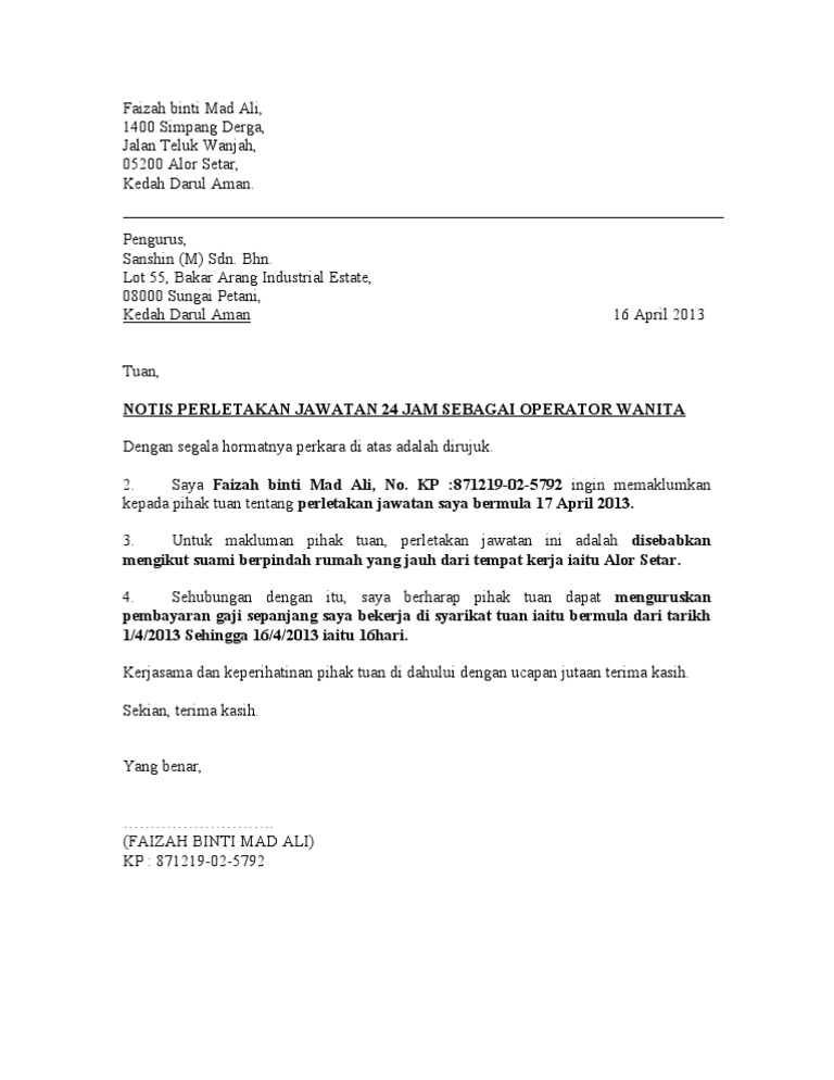 Related : Notis Perletakan Jawatan 24 Jam - Contoh surat perletakan jawatan 24 jam 2 minggu sebulan..
