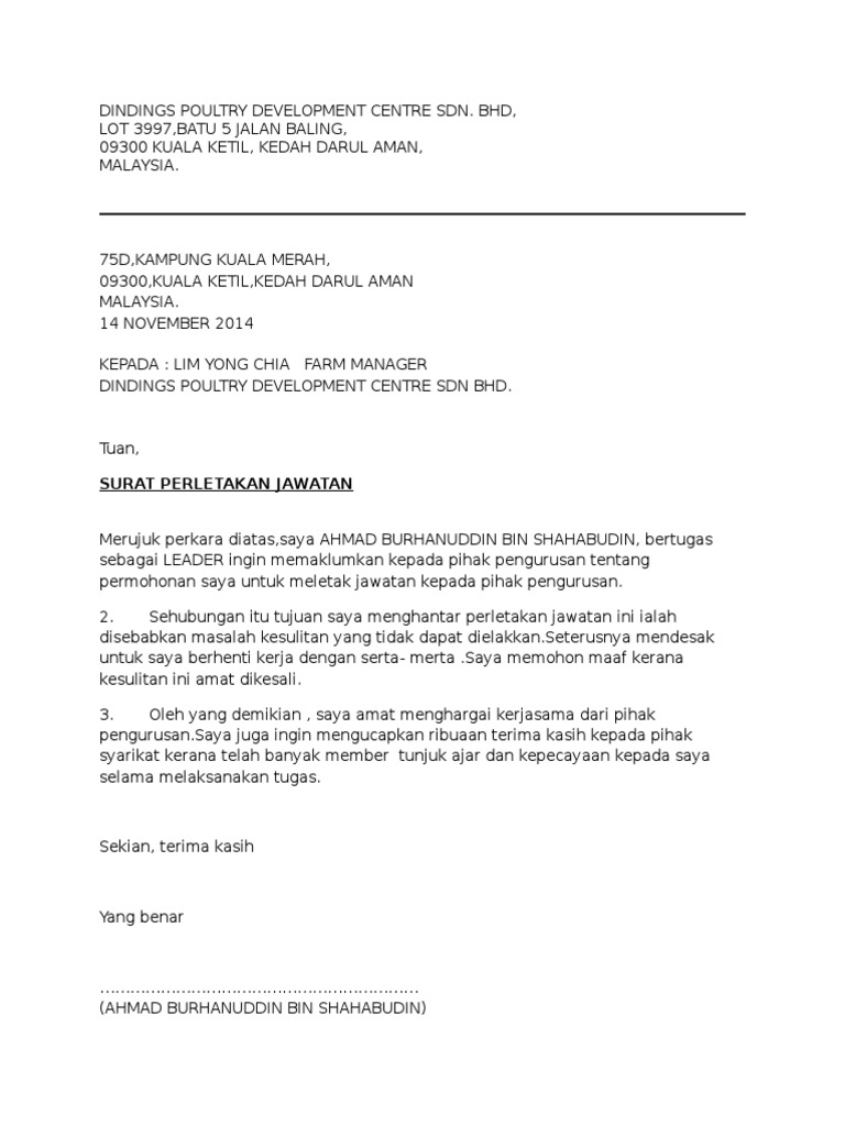 Contoh berhenti kerja mudah dengan notis 24 jam/serta merta. Surat berhenti kerja yang ringkas dan terbaik blog informasi. Saya roslan bin ani bertugas sebagai pelayan restoran kfc cawangan mersing ingin memaklumkan mengenai perletakkan jawatan saya yang berkuatkuasa serta merta mulai 26 april 2018. Berikut contoh surat pengunduran diri yang dapat anda selain itu, dalam hal pembuatan surat berhenti kerja perlu kita perhatikan dalam penyusunan kerangka surat serta komponen. Ini adalah beberapa contoh surat rasmi berhenti kerja yang mudah dan ringkas.