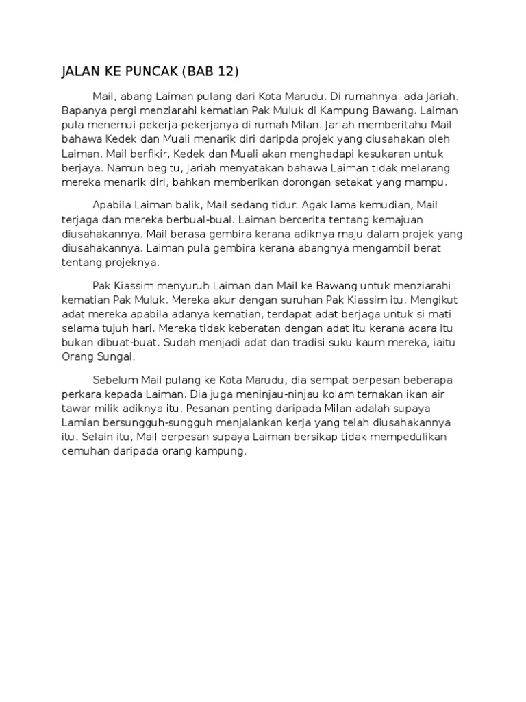 Learning port interactive (lpi) merupakan portal pembelajaran yang dibina selaras dengan keperluan silibus pelajar tahun 1 hingga tingkatan 5. Novel darah titik di semantan. Karangan respons terbuka tahun 2018 jenis soalan jumlah bil. Jalur puncak 2 ialah sebuah jalan alternatif yang menghubungkan jonggol / citeureup bogor dengan cipanas cianjur. Dia dihantar ke sebuah syarikat minyak di sarawak untuk menjalani latihan industri. Menilik wajah wajah yang datang ke puncak bukit tinggi perkebunan teh kemuning dan model kendaraan yang dipakai, pengunjung dapat dibedakan menjadi beberapa macam yaitu wisatawan keluarga dengan ayah ibu dan anak dengan mobil atau sepeda motor untuk mencapai lokasi ini Watak & perwatakan, plot dan nilai pengajaran. Ada per 3 an pasar. Novel 'jalan ke puncak' edisi murid mengandungii 122 muka surat, termasuk 13 halaman paparan ilustrasi dan satu halaman glosari. Muat turun nota nota ringkas: Novel yang saya kaji ialah novel jalan ke puncak, karya juri durabi. Danel sering datang ke rumah nenek dan membantu nenek memasak. Namun begitu, mujurlah kebakaran itu berlaku semasa laiman pergi ke kuching.
