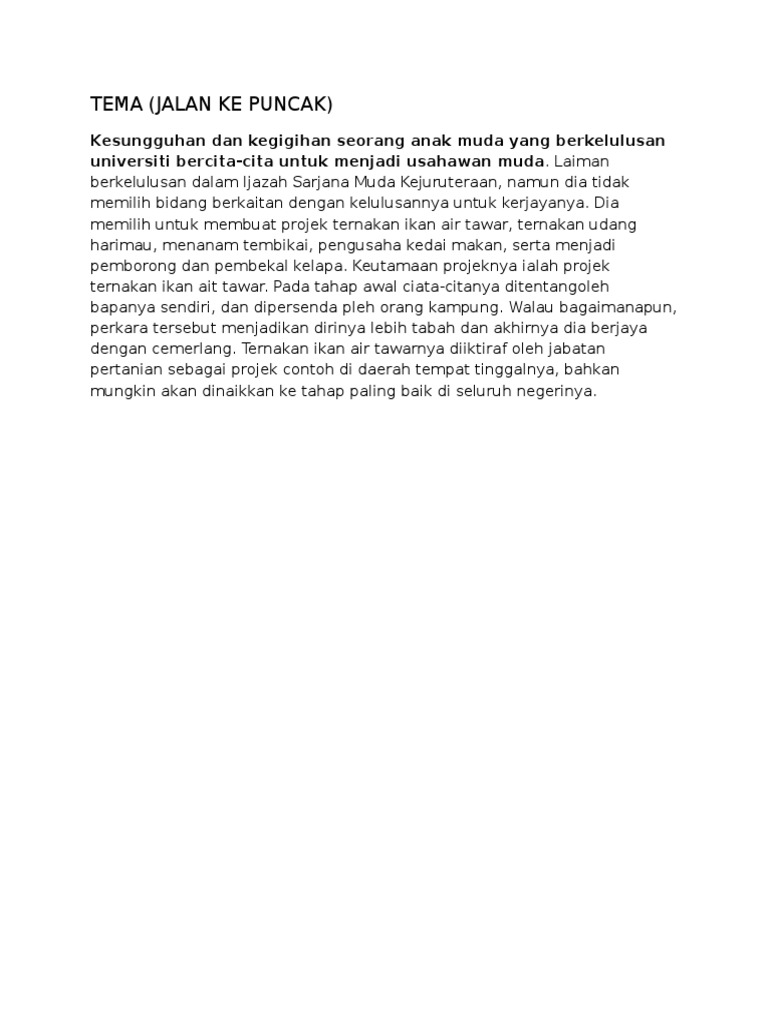 Ada per 3 an pasar. Sukri menjadi tidak tenang apabila memikirkan peristiwa tangki minyak milik syarikat tempat dia bekerja itu terbakar. Minda subur / fail menimbun, kewangan syarikat tidak kukuh, dan terdapat ejen yang tidak m. Novel jalan ke puncak (k). Jalan ke puncak (tingkatan 2). Kandungan soalan struktur soalan esei latihan pengesahan catatan bahagian a : Menilik wajah wajah yang datang ke puncak bukit tinggi perkebunan teh kemuning dan model kendaraan yang dipakai, pengunjung dapat dibedakan menjadi beberapa macam yaitu wisatawan keluarga dengan ayah ibu dan anak dengan mobil atau sepeda motor untuk mencapai lokasi ini Namun begitu, mujurlah kebakaran itu berlaku semasa laiman pergi ke kuching. Tema dan persoalan (novel bahasa melayu tingkatan 2) (juri durabi). Laiman yakin pengalaman tanpa kelulusan juga mampu mengubah nasib kehidupan seseorang. Dia dihantar ke sebuah syarikat minyak di sarawak untuk menjalani latihan industri. Dalam perjalanan ke dungun, lili bertemu danel dan juga geetha dalam bas. Sinopsis bab 1, 2, 3 (novel tingkatan 2).
